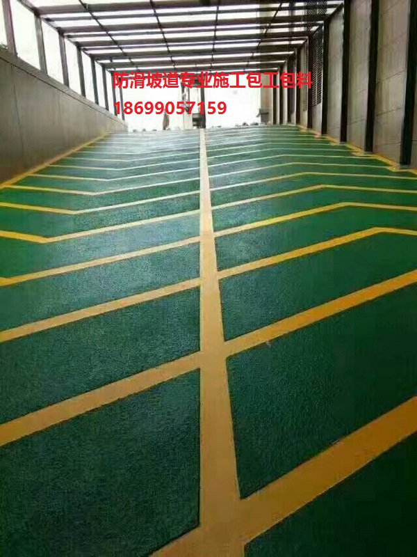 施工工藝: 一、 基層處理: 1、基底層的強度不小 于C25,且不能因收縮龜裂,沒有空鼓。 2、混凝土表面須全面清除油污、劣質松動水泥塊等表面異物。 3、開始施工前請用清水洗地面一遍再施工。 二、 界面黏結層: 1、以DE10W黏結劑,加 適量水泥拌合后,直接置于混凝土面,確保素地與 膠合層的牢靠結合。 三、 膠合抗壓層: 1、待黏結底干燥后,再施做膠合抗壓基層。本層以高耐磨級配式之無機質 非金屬骨材,纖維礦物與樹脂等混后,直接以饅刀施做確?;椎目箟簭姸扰c防水,并再次整平地面。(厚度約4mm) 四、 彩色防滑面層: 1、待膠合抗壓層干燥后,以噴漿方式施做 面層,利用巨大之比表面積達防 滑效果。本層結構耐磨,表面粗糙、均勻,不會造成車輛進出時的震動。